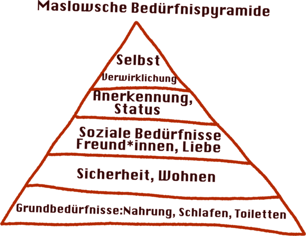 Selbstverwirklichung stellt darin die oberste bzw. die fünfte von fünf Bedürfnisstufen dar. Zuvor müssen demnach auf der 1. Stufe Nahrung, Sauerstoff, auf 2. Sicherheitsbedürfnisse, auf 3. Sozialer Austausch und auf 4. Individualbedürfnisse wie Liebe oder Wertschätzung sichergestellt sein (53).