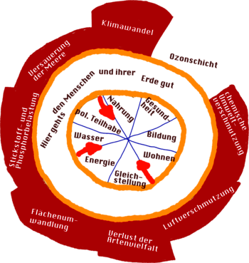 Eine Darstellungsform, die anstatt des -BIP- das Wohlergehen der Wirtschaft anhand ökologischer und sozialer Grenzen eines Donut darstellt. Blickt man von oben auf einen Donut, so hat dieser zwei Grenzringe, einen nach innen und einen nach außen.
