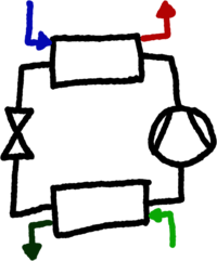 Ein technisches Gerät bzw. eine Maschine, die Wärme niedriger Temperatur z. B. aus der Außenluft oder oberflächennah aus dem Boden entnimmt und auf ein nutzbares Temperaturniveau z. B. für Heizungswärme oder Trinkwarmwasser anhebt. Dazu wird ein Kältemittel auf eine Temperatur unterhalb der Umweltwärme entspannt, sodass die Wärme z. B. aus der Luft an das kältere Kältemittel übertragen werden kann. Dann wird das Kältemittel wie mit einer Luftpumpe verdichtet, wodurch die Temperatur steigt und dadurch nutzbar gemacht wird.