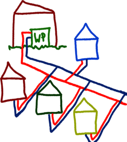 Die Verteilung erfolgt meist mittels einer Vor- und einer Rücklaufleitung. Also warmes Wasser wird zu den Verbrauchern gefördert, dort kühlt es ab un gelangt zu den Erzeugern, um dieses zu erwärmen.